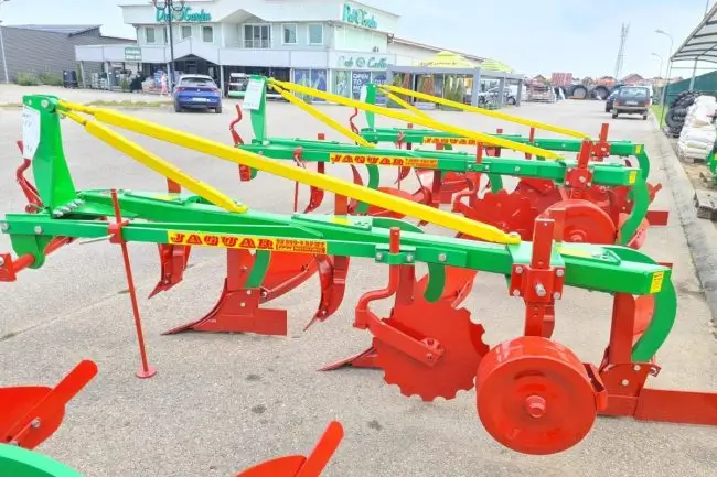 Plugovi Jaguar 1050 su plugovi promjenjljivog radnog zahvata 14-16-18”, opremljeni raonim pretplužnicima,metalnim točkom za regulaciju dubine oranja te crtalom na zadnjem pluznom tijelu. Ovi plugovi se isporučuju u varijanti sa spiralnom „Y“ daskom.